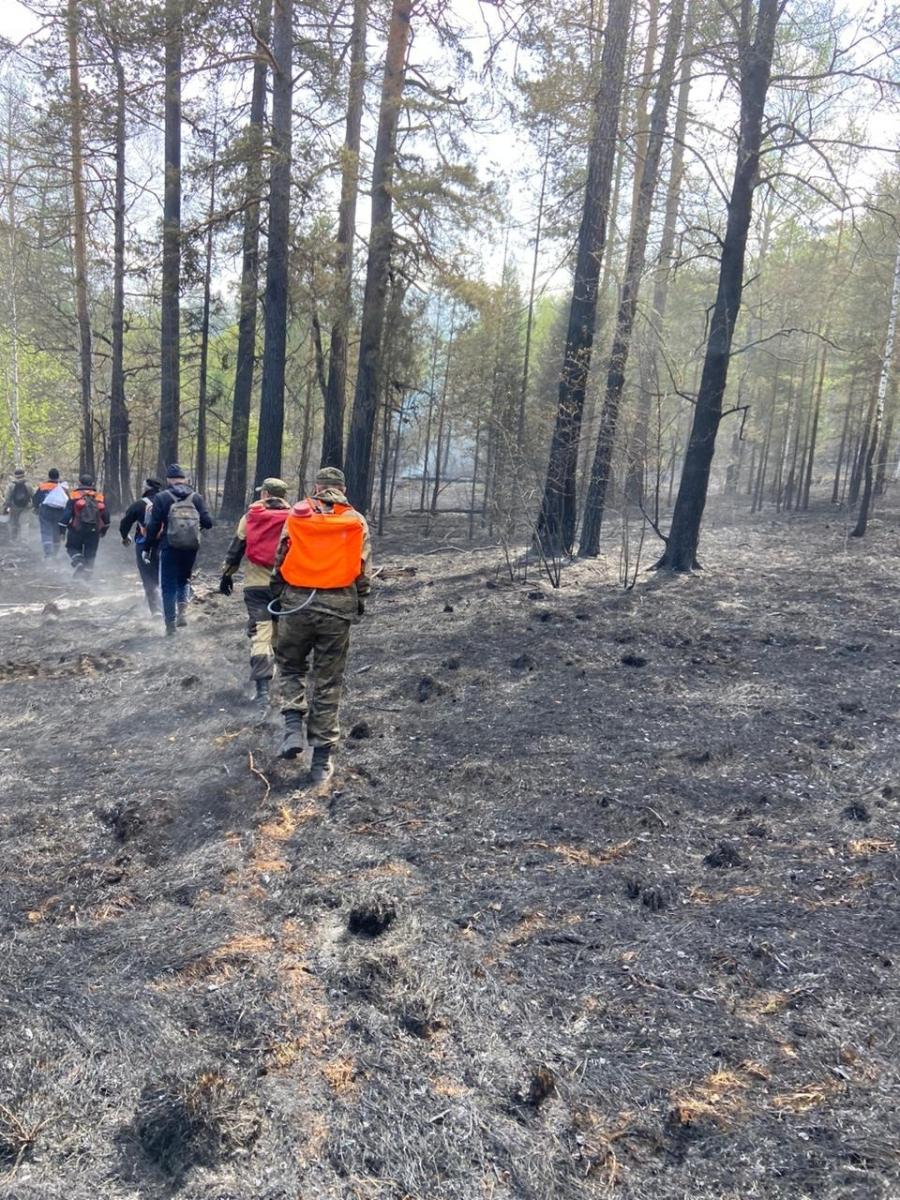 На одной из фото: госинспектора и волонтёры несут воду в ранцах для тушения лесного пожара